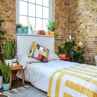 Coin bureau et exemple d'une chambre parentale exotique de taille moyenne avec un sol en bois foncé et aucune cheminée.